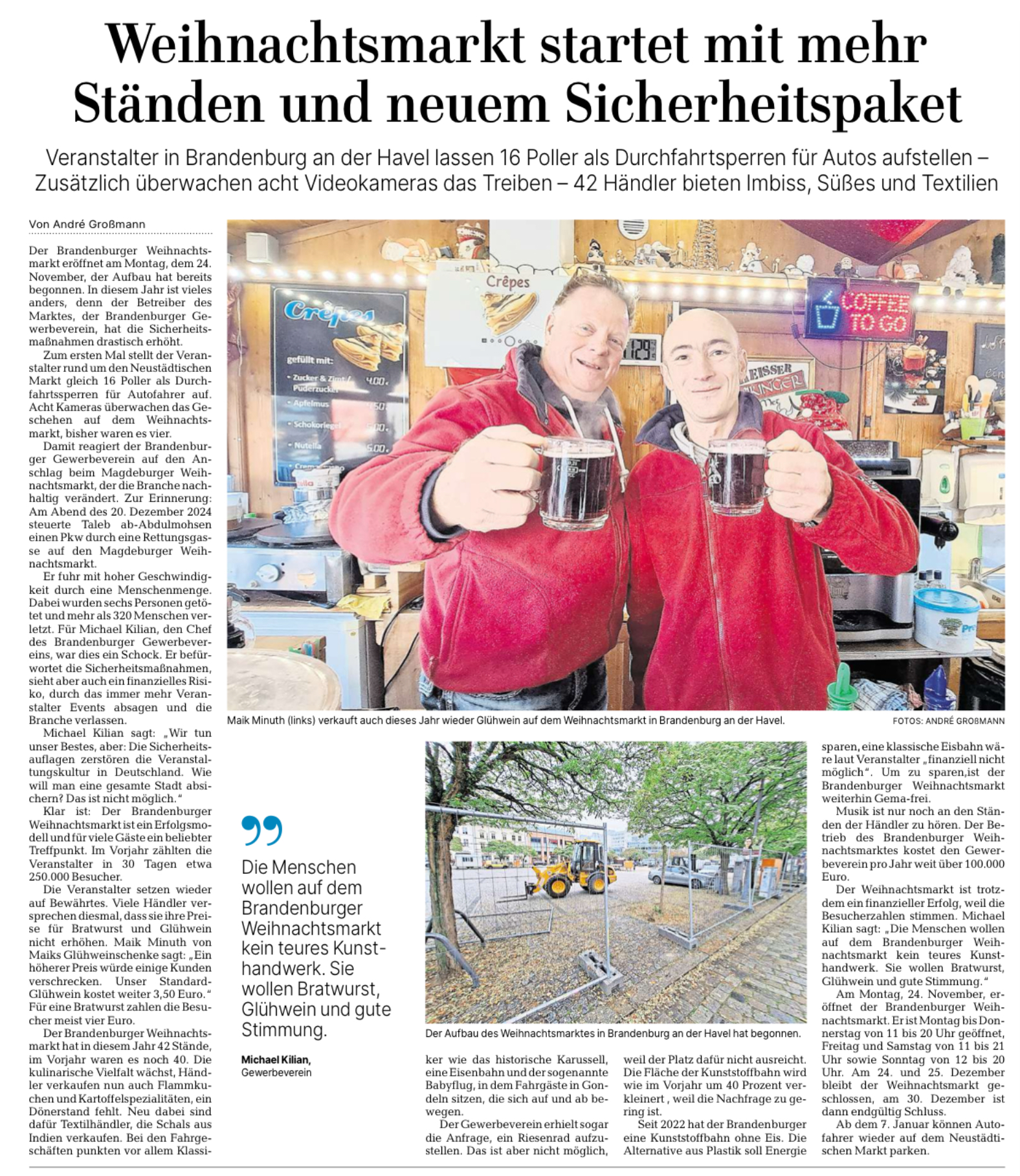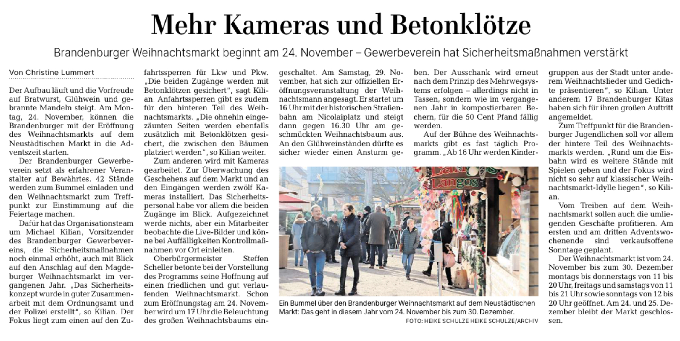 MAZ vom 18. November 2025Weihnachtsmarkt startet mit mehr Ständen und neuem Sicherheitspaket